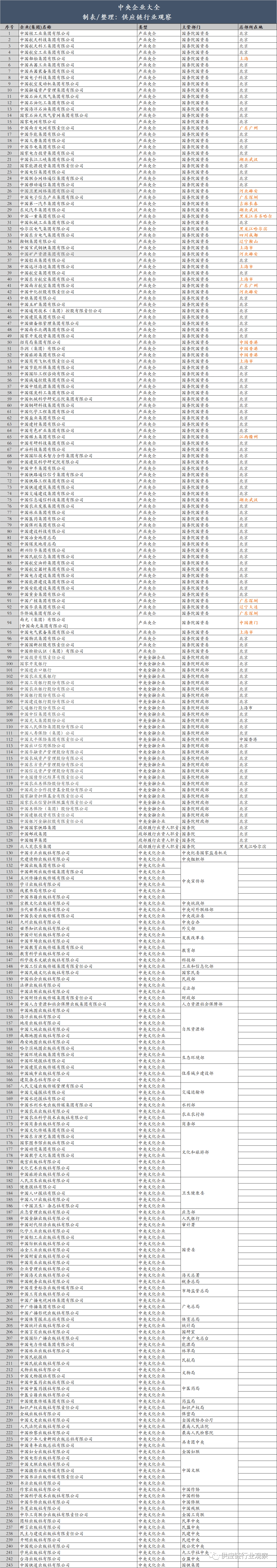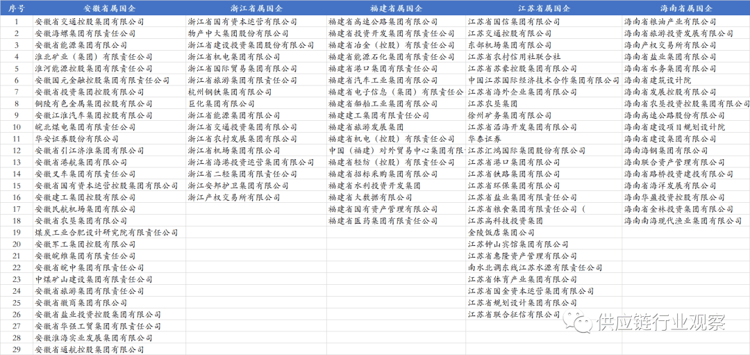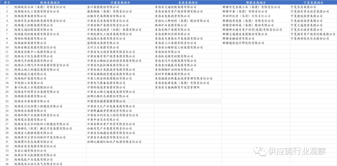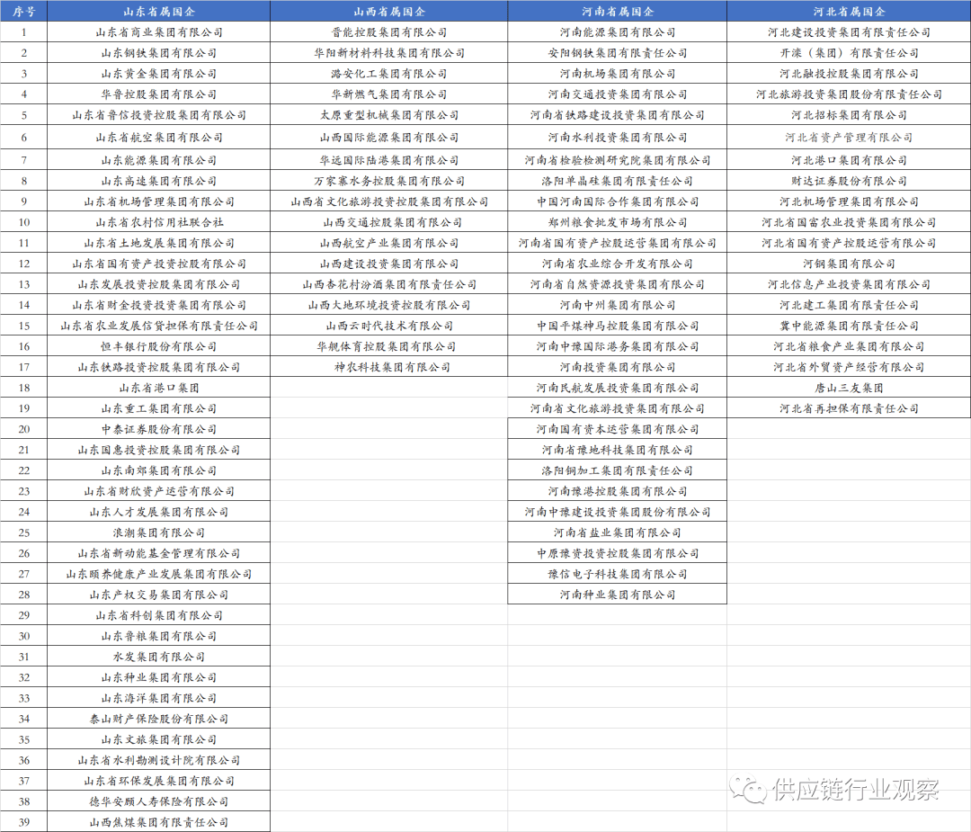 我国目前各类央企共243家,此中有列入国务院国资委央企名录的央企98家、列入财务部地方企业名录的央企145家。这些央企和国企正在2022年的停业收入是82。6万亿,净利润是4。32万亿,上缴税收5。93万亿。约有员工3390万。4月3日,易华录发布通知布告暗示公司收到现实节制人中国华录集团无限公司(以下简称华录集团)通知,华录集团正正在取中国电子科技集团无限公司(以下简称中国电科)规画沉组事项,华录集团拟整合进入中国电科。华录集团取中国电子科技集团整合后,国务院国资委监管的地方企业数量或将由现正在的98家削减为97家。排名1-53的为副部级央企。前53家地方企业的董事长、党委(党组)、总司理的人选由地方局常委会研究决定,这取一般副部长级干部的任免权限不异,因而被认为相当于副部级干部。所以,前53户正在报道中被称为中管企业,可是正在地方发文中,一般称为部门国有主要企业。除前53家央企,其余央企的代表人(大都是董事长)须报国务院党组任前存案同意。其监管由国务院国资委企业带领人员办理二局(简称“企干二局”)担任。前1-10为涉军工央企,别离为:中国核工业集团、中国航天科技集团、中国航天科工集团、中国航空工业集团、中国船舶集团、中国刀兵工业集团、中国刀兵配备集团、中国电子科技集团、中国航空策动机集团、中国融通资产办理集团。第11-22为能源类央企,此中11-14为石油类央企,别离为中石油、中石化、中海油及国度石油天然气管网集团;15-22为两大电网(南方电网、国度电网)及六大发电集团(华能、大唐、华电、国电投、三峡和国度能源集团);23-27为通信及电子消息央企,别离为:中国电信、中国联通、中国挪动、中国卫星收集集团、中国电子消息财产集团;28-33为配备制制类央企,别离为:中国一汽、春风汽车、中国一沉集团、中国机械工业集团、电气集团、中国东方电气集团;34-37为矿产资产类央企,别离为:鞍钢、中国宝武、中国矿产资本集团、中国铝业集团;38-41为交通运输行业央企,中国近海海运集团、中国航空集团、中国东方航空和中国南方航空集团。42-43为涉农类央企,包罗中国中化和中粮。此外,包罗中国五矿集团、通用手艺集团、中建集团、中国储蓄粮集团、中国南水北集结团、国投集团、招商局集团、华润集团、中国旅逛集团、中国商飞集团分属分歧业业。此外,正在这98家央企中,国务院国资委核准的以金融为从业的央企共3家,包罗中国五矿集团等。以房地产为从业的央企共16家。地方金融企业名录由财务部发布,目前共27家。地方金融企业共分地方办理带领人员的金融企业(以下简称中管金融企业)和其他地方金融企业。其他地方金融企业则为施行国有金融本钱办理相关轨制,由财务部代表国务院履行国有金融本钱出资人职责,纳入国有企业运营预算办理、担任组织实施年度绩效评价等工做。此中中管地方金融企业15家,别离为中国投资无限义务公司、三大政策性银行(国度开辟银行、中国进出口银行、中国农业成长银行)、五大国有贸易银行(工行、农行、中国银行、扶植银行、交通银行)、两大金控央企(中信集团、光大集团)及四大安全集团(中国人保、中国人寿、承平安全、中国出口信用安全集团)。其他地方金融企业12家,别离为四大资产办理公司(华融、长城、信达、东方)、中债登、中国农业再安全、中国政企合做投资基金股份无限公司、国度融资基金无限义务公司、国度农业信贷联盟无限义务公司、中国再安全(集团)股份无限公司、中国建银投资无限义务公司及中国银河金融控股无限义务公司。由国务院授权财务部履行出资人职责的企业共4家,别离为中国国度铁集团、中国邮政集团、中国烟草总公司、北大荒农垦集团无限公司。 省属国企凡是正在区域内储蓄积累最优良的财产资本、金融资本和“行政”资本,此是开展供应链金融适宜的企业类型之一。外行业分布上看,省属国企次要涵盖金融、建工、交通根本设备投资扶植(高速公、轨道交通、铁扶植)、商业买卖(产权买卖、集中采购等)、物流根本设备(如机场、口岸)、矿产资本、林业资本、高端制制等,具有丰硕的供应链金融开展的场景。江山四省指河南、、山东、山西。这四个省,又被称为菜园子、气罐子、粮坛子、矿坑子。因各类资本取工农业资本不婚配,而被网友以“江山四省”自嘲之。但正在供应链金融范畴,我们认为这四个省的国企是走正在了全国相对前列的。以至正在政策、专营机构设置、平台扶植、产物立异等方面,四省的某些做法遥遥领先。按照各地国资委披露的监管企业名录,江山四省共有省属国企103家,数量上占全国比沉的16%摆布。此中,属国企38家、山西省属国企18家,河南28家,19家。具体名录如下,下表山西焦煤应为山西省属国企: 是国内首个出台供应链金融专项支撑财务政策的省份,供应链金融成长程度较高,部门国企设立了保理公司,搭建了供应链金融平台。以山东保养健康财产成长集团无限公司为例,旗下鲁康保理于2022年10月设立,本年1月,“山东健康信链”供应链金融办事平台启动投标,目前已完成投标。此外,属国企如山东口岸、山东高速、山东钢铁、山东能源等均连系本身环境建立了本身供应链金融办事系统,且多个平台规模已超百亿。据山港易付动静,2022年12月20日,山东口岸集团旗下